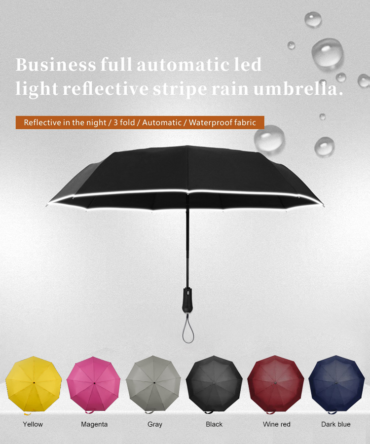 | Name: | automatic open 3 fold waterproof reflective led light rain umbrella |